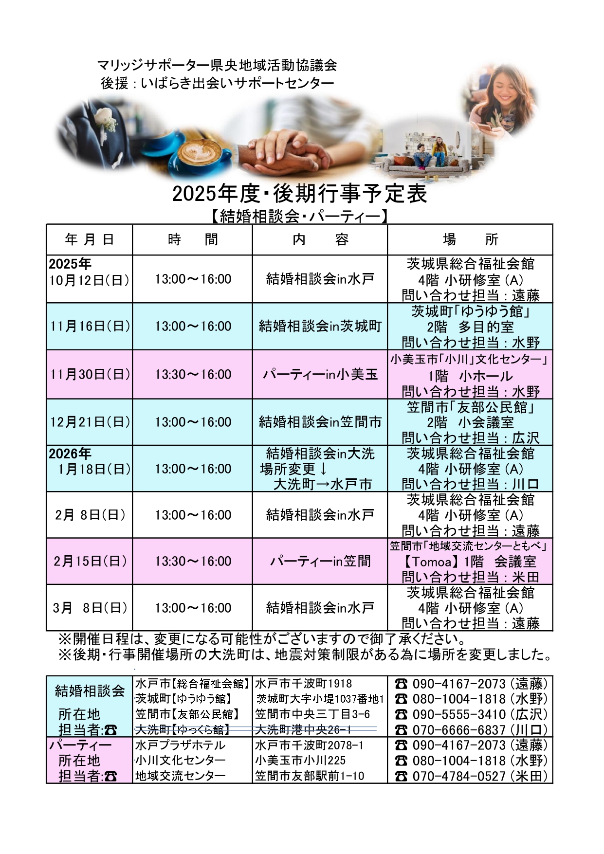 開催日等は、いばらきマリッジサポーター県南地域活動協議会のHPよりご確認ください。 いばらきマリッジサポーター県南地域活動協議会 (ims-kn.com) |
